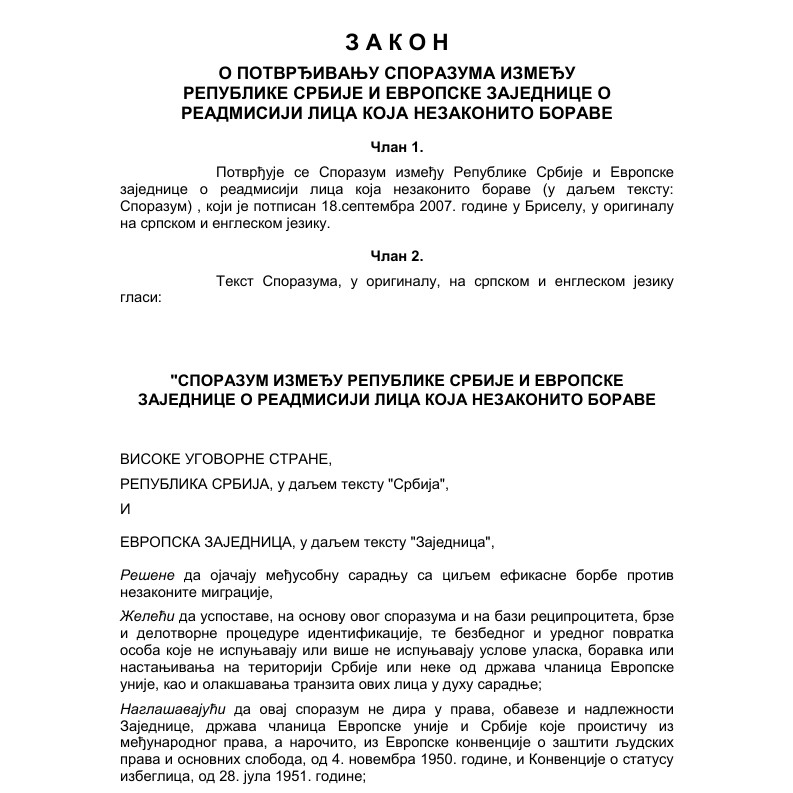 Zakon o potvrđivanju sporazuma između Republike Srbije i Evropske zajednice o readmisiji lica koja nezakonito borave